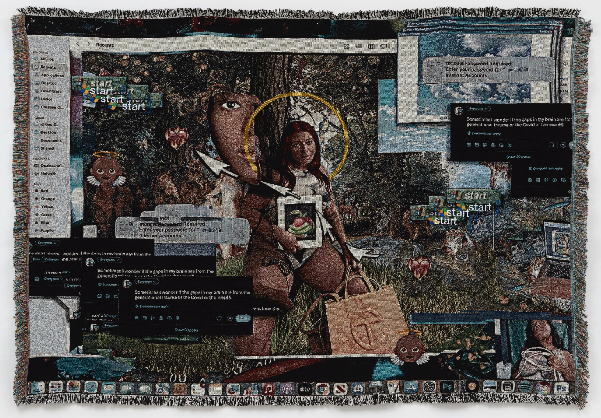 Wood is an interdisciplinary artist whose work contemplates realities around black female ontology that do and might exist. Inspired by a familial relationship to textiles, queer craft, Microsoft Paint and internet avatars Wood’s tufted and tapestry pieces mesh traditional craft and contemporary technological materials. Together, Qualeasha navigates both an Internet environment saturated in Black Femme figures and culture, and a political and economic environment holding that embodiment at the margins.